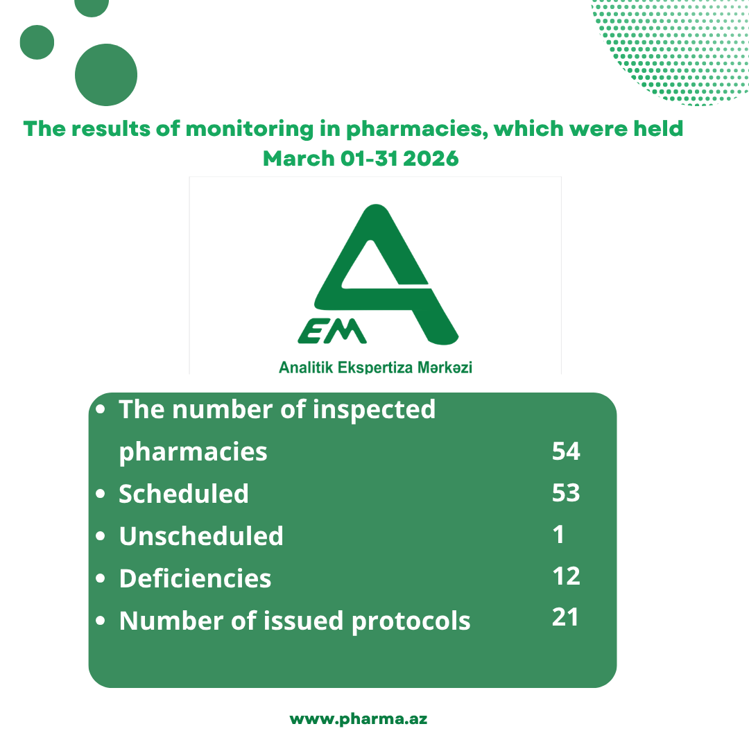 In March 2026, the Analytical Expertise Center under the Ministry of Health of the Republic of Azerbaijan conducted inspections in a total of 54 pharmacies. Of these, 19 inspections took place in the city of Baku, while 35 were conducted in pharmacies located in other cities and regions of the country.