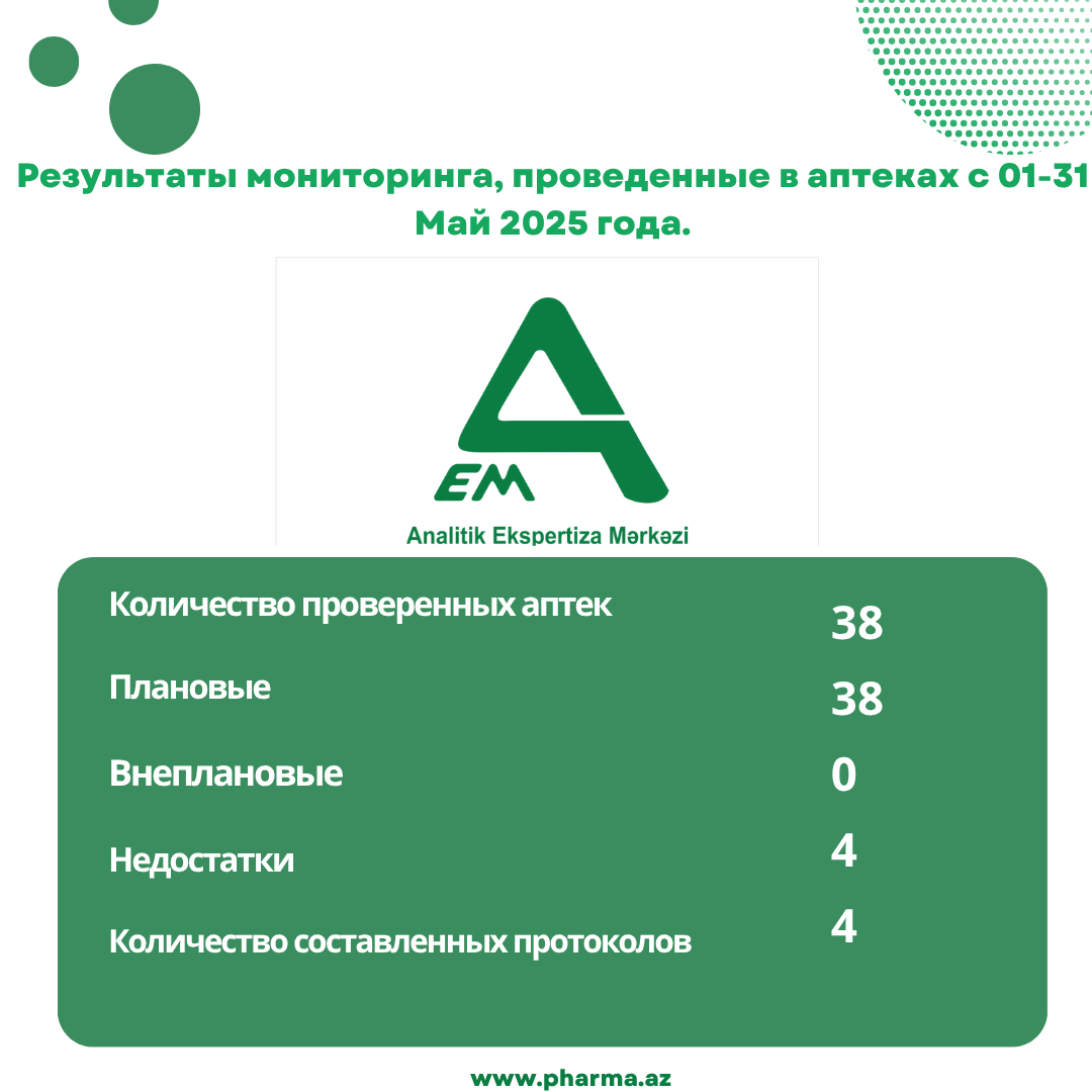 Центр Аналитической Экспертизы Министерства Здравоохранения Азербайджанской Республики в мае 2025 года провёл плановые проверки в 38 аптеках, из них 12 — в городе Баку, и 26 — в других городах и районах страны.