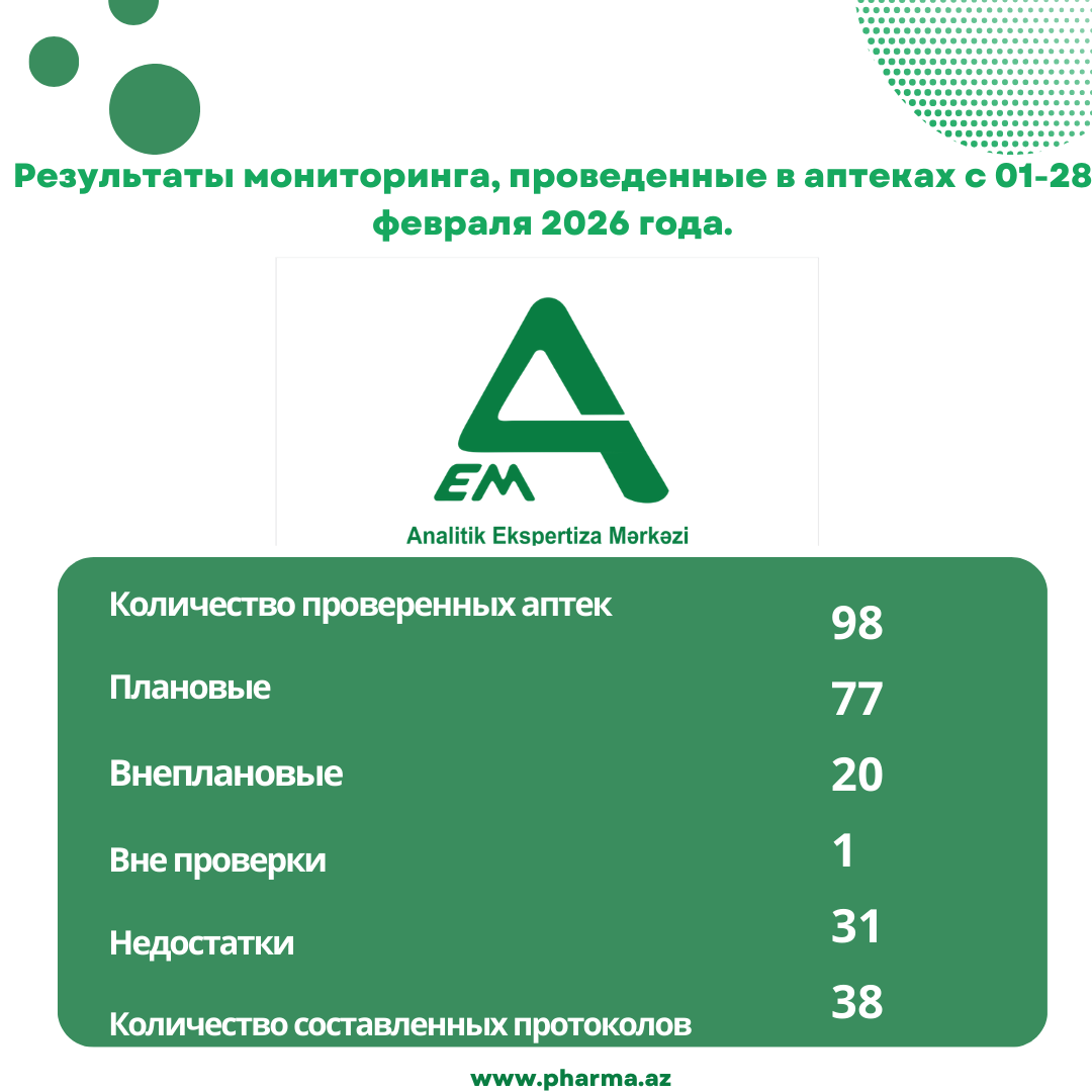 В феврале 2026 года Центром аналитической экспертизы при Министерство здравоохранения Азербайджанской Республики проверки были проведены в общей сложности в 98 аптеках. Из них 23 проверки – в городе Баку, а 75 — в аптеках, расположенных в других городах и районах республики.